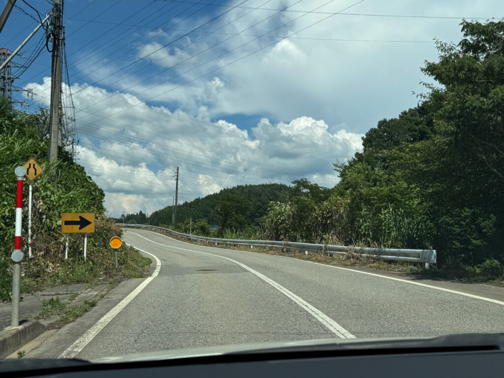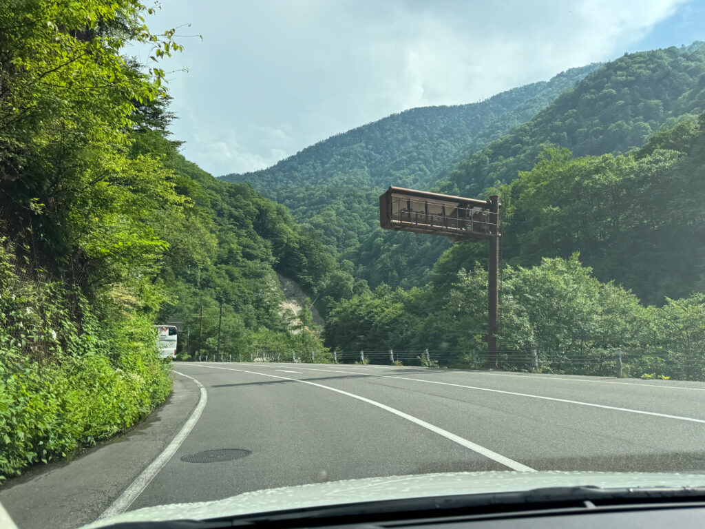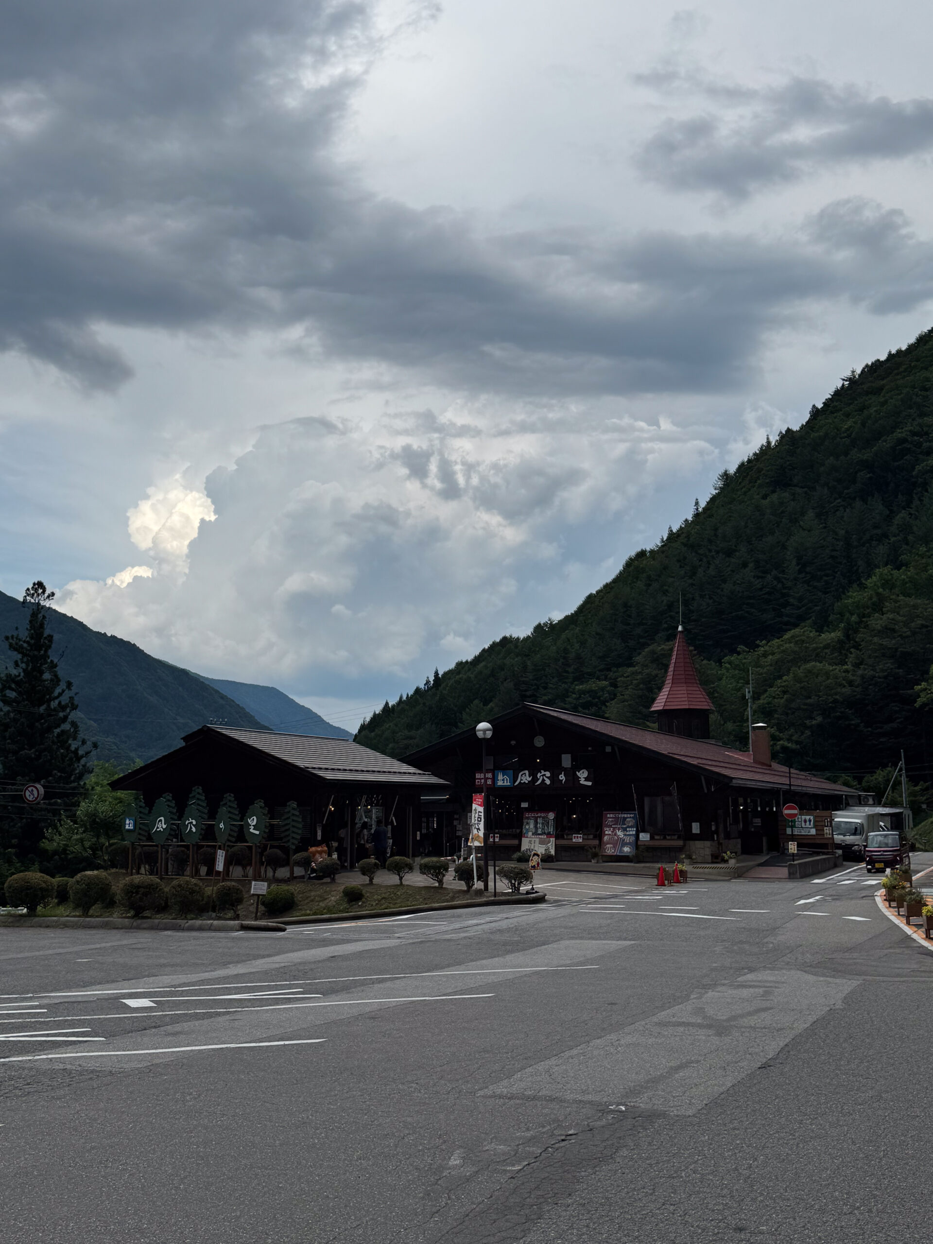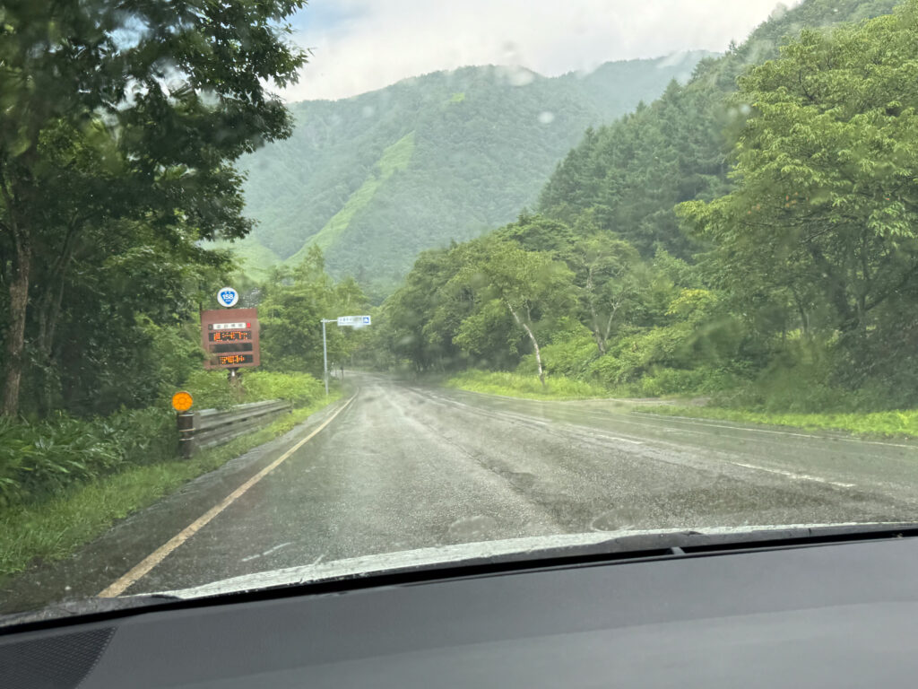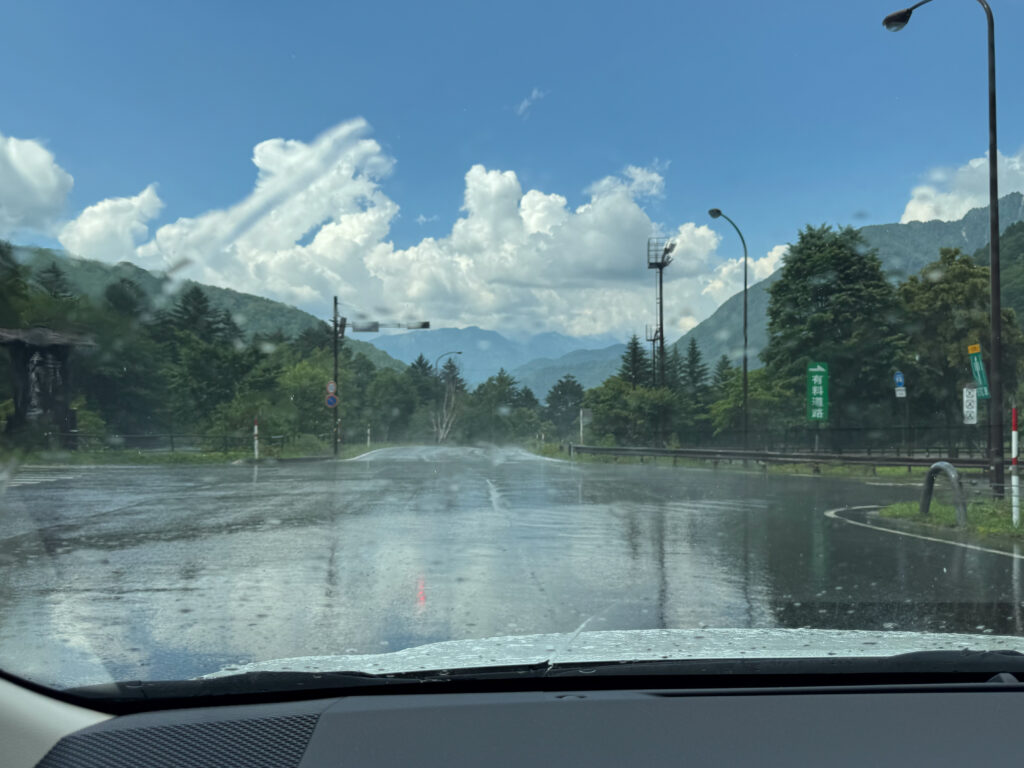 La route serpente et nous la suivons doucement, telle une tortue 🐢. Les paysages et le temps change également, nous aurons de la pluie, descendons à 20 degrés pour arriver dans les bouchons à Matsumoto à 29 degrés, sous un ciel couvert. La route que nous avons prise passe par le Nord des Alpes et est une alternance de tunnels et de petits tronçons.